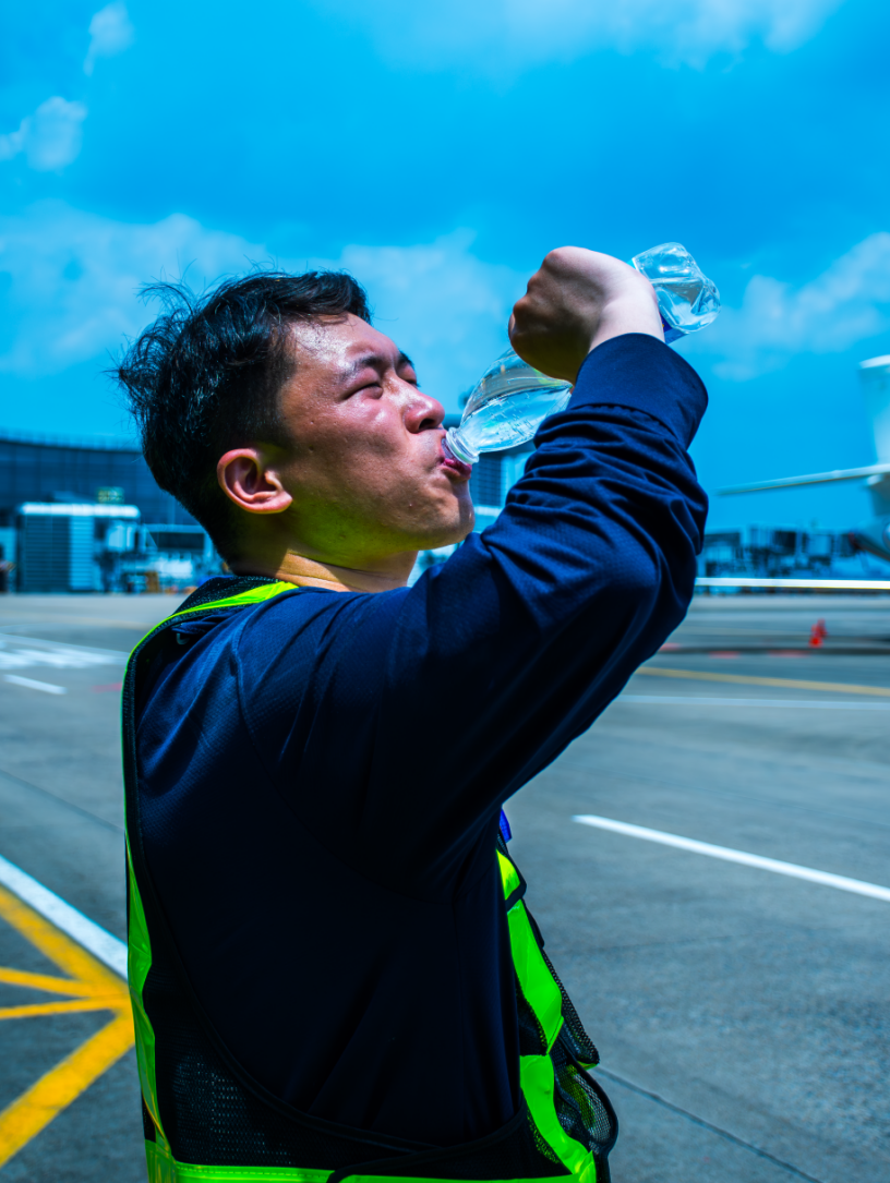 隨著雨水退場,浙江多地重啟“高溫模式”。在這炎炎烈日下,保安公司的一線員工們堅守在停機(jī)坪的各個崗位上,用汗水守護(hù)著每一架航班的安全起降。