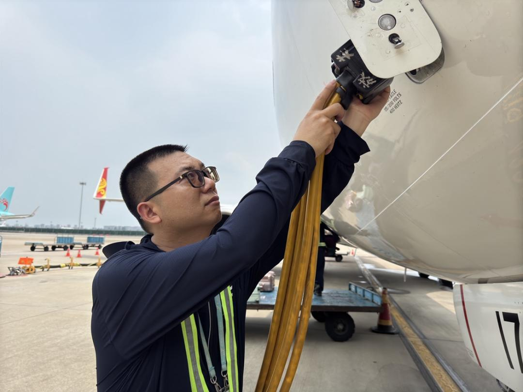 橋載操作員楊海江正專注地進(jìn)行地面電源接駁作業(yè),烈日下,近距離可以看到豆大的汗珠不斷從他的臉頰滑落?!肮竞笄诒U虾艿轿唬彼亮瞬梁?,邊說邊從防曬服口袋掏出藿香正氣水和人丹,“不僅配發(fā)了防曬服和防暑藥品,下午還會送來綠豆湯、鹽汽水。這些實實在在的關(guān)懷讓我們工作更有動力了!”