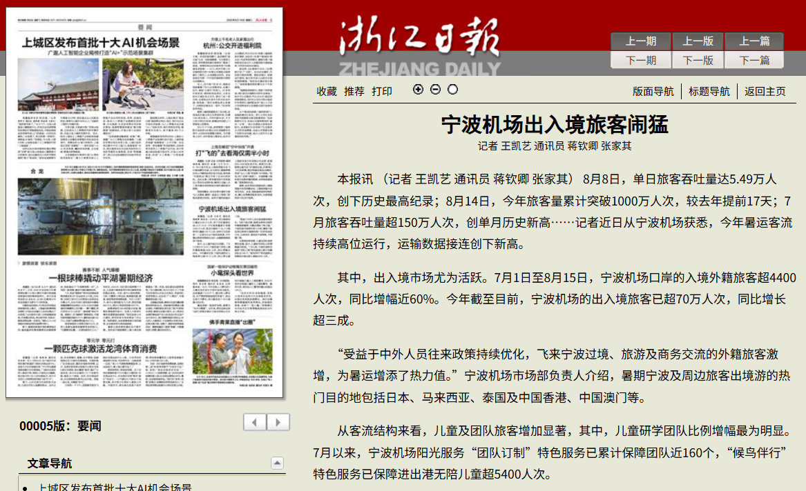 7月31日,浙江日?qǐng)?bào)報(bào)道《寧波機(jī)場(chǎng)出入境旅客鬧猛》。