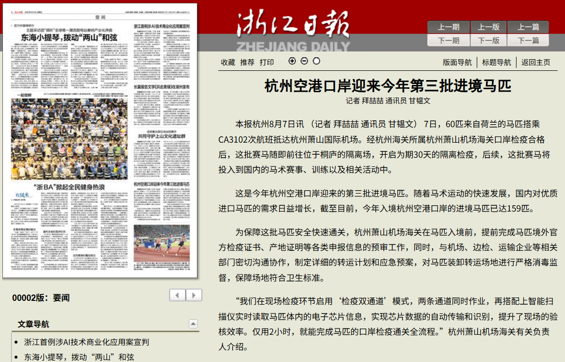 8月7日,浙江日報報道《杭州空港口岸迎來今年第三批進境馬匹》。